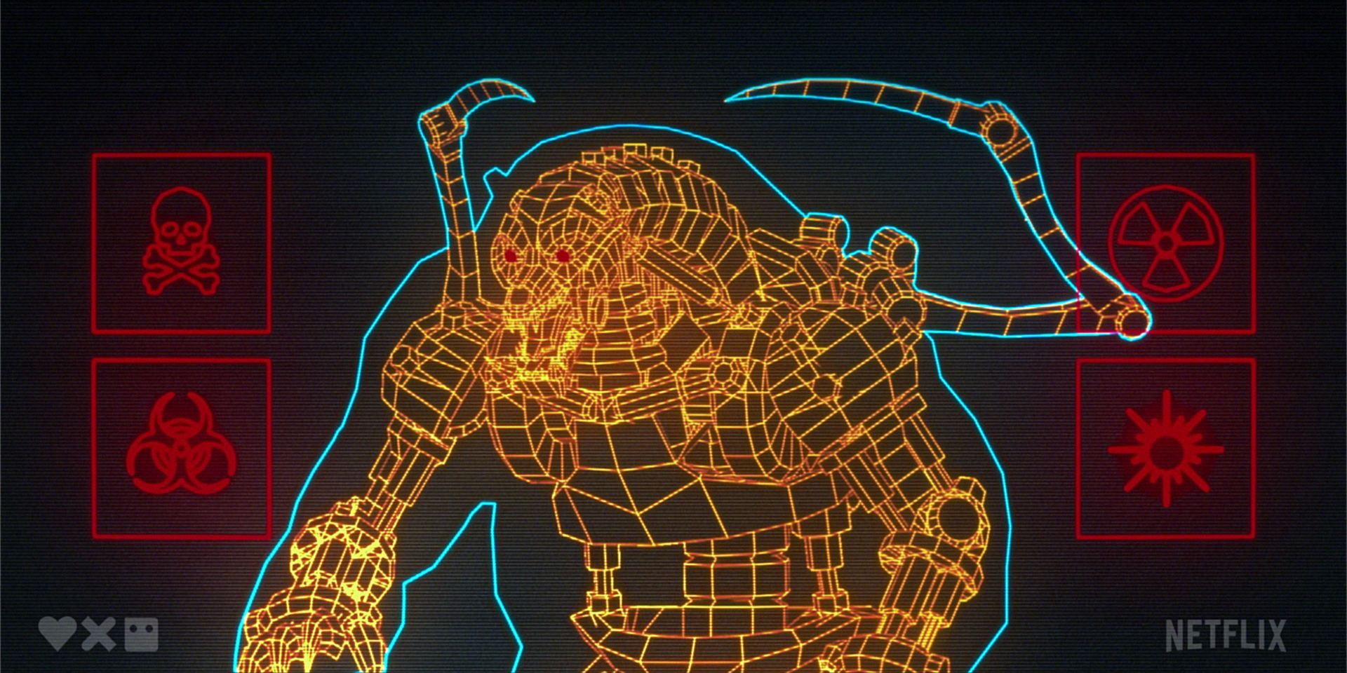 Love, Death & Robots is so unique since it has such varying aesthetics per episode. We took a very simplified approach to Kill Team Kill's anime art style with the Barghest Diagnostic screen. The design and animation were inspired by old school lo-fi tech screens from the ‘80s along with era-appropriate scanline compositing approach.